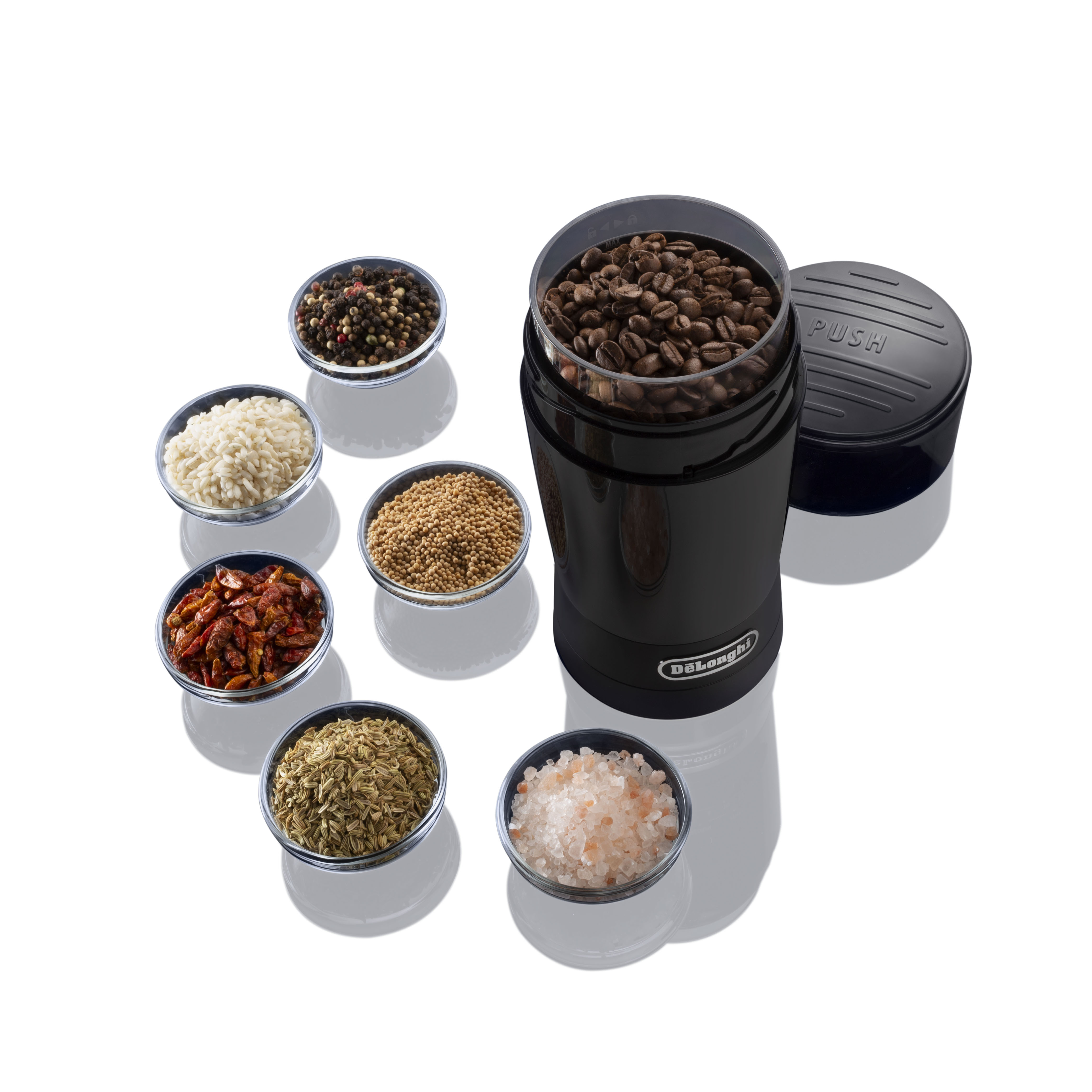 The De'Longhi coffee and spice grinder is designed for simplicity with a 'push to grind' system to easily control the process. Simply pour the beans, and press the top until the desired level of grinding is reached. Perfect for not only coffee, but spices and condiments as well.